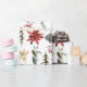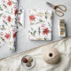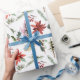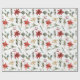 Papel de embalagem de férias de inverno vivo que apresenta um padrão de poinsetos vermelhos e brancos pintados a aquarelas, holly com bagas e pinheiros e galhos, segundo padrão repetido, em papel branco.