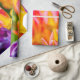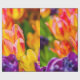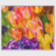 Tulipas coloridas num leito de flores. Praticamente todas as cores do arco-íris estão presentes. Bela e positiva cena floral. Papel de Presente.