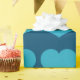 Este papel de embrulho apresenta um padrão repetitivo de corações em turquesa em forma de fundo azul. Excelente para um bebê chá, batismo ou primeiro aniversario.