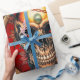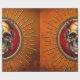 Um crânio cuja presença inspira admiração e fascínio. Seu crânio é marcado pelo tempo, carregando um tesouro radiante em seu centro, uma pedra preciosa que pulsa com cores brilhantes e guarda o segredo da vida e da morte. As tomadas oculares do crânio brilham como dois carvões brilhantes, vermelho vivo e perfurando, como se eles pudessem ver os segredos mais profundos da alma. Uma coroa de folhas de filigre, cujas veias verdes contrastam com o osso pálido. Este abraço vivo simboliza o eterno ciclo da vida e da morte, enquanto uma cadeia articamente trabalhada a rodeia - um sinal da ligação inseparável entre os mundos.