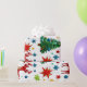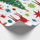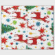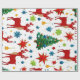 Um padrão festivo de Natal. Apresenta renas vermelhas, árvores de Natal verdes, flocos de neve azuis e estrelas vermelhas sobre um fundo branco. O padrão se repete perfeitamente, criando um design festivo e alegre. Seria perfeito para embrulhar papel, cartões de saudação ou outras decorações de férias.