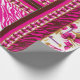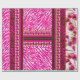 O design parece ser um design para uma roupa, possivelmente um vestido ou tecido tradicional. Aqui está uma descrição detalhada: ・ Seção Superior: Apresenta um padrão floral com flores cor-de-rosa e folhas verdes sobre um fundo branco. A linha do pescoço é embelezada com designs cor-de-rosa ornamentado e dourados. ・ Banda média: contém uma impressão em cor rosa e branco, delimitada por duas tiras delgadas de ouro. ・ Seção Inferior: repete extensivamente o padrão de impressão animal. A combinação de impressões florais e animais cria uma declaração de moda vibrante e ousada, possivelmente para traje cultural.