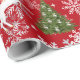 Elegant, modern, festive Christmas wrapping paper with a unicorn pulling Santa's sleigh towards a fir tree decorated with silver baubles. The unicorn has a red and golden mane and tail and the sleigh carries Santa along with many gifts. On a Christmas red background, with many cute snowflakes.