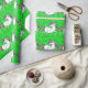 Um papel de embrulho de unicórnio colorido, esparso e esbranquiçado, com um padrão de pequenos unicórnios gordinhos, com cabelo cor arco-íris, homem e cauda, estrelas douradas em seus corpos e cascos de ouro. Eles estão dançando sobre um fundo verde brilhante de brilho brilhante. Este invólucro verde de unicórnio seria ideal para um presente de festa de aniversário infantil, para artesanatos de unicórnio e muito mais.