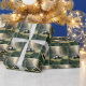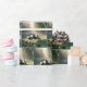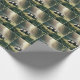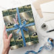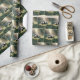 Um panda está deitado de costas em uma floresta serena de bambu banhada em luz solar suave que atravessa as árvores
