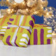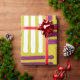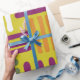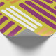 Papel de embalagem roxo, laranja e verde para aniversários.