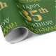 Este design de papel de embrulho apresenta uma mensagem como "FELIZ 35º ANIVERSÁRIO", com o "35º" a ter uma aparência falsa/imitação de ouro. Também apresenta um nome personalizado e um fundo de cor verde. Talvez possa ser utilizado quando se dá presentes para o trigésimo quinto aniversário de alguém. [~Z0000132]