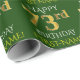 Este design de papel de embrulho apresenta uma mensagem como "FELIZ 73º ANIVERSÁRIO", com o "73º" a ter uma aparência falsa/imitação de ouro. Também apresenta um nome personalizado e um fundo de cor verde. Talvez possa ser utilizado quando se dá presentes para o setenta e terceiro aniversário de alguém. [~Z0000132]