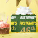 Este design de papel de empacotamento apresenta uma mensagem como "PRIMEIRO NOME DO 46º ANIVERSÁRIO!", com o "46º" a ter uma aparência de cor falsa/imitada em forma de ouro, e com o nome e o "ANIVERSÁRIO" numa fonte divertida e ousada. O nome é personalizável e o fundo é verde colorido. Um papel de embrulho como este poderia talvez ser usado para embrulhar presentes de aniversário que são dados a alguém em comemoração de seus quarenta e seis anos. [~Z0000208]