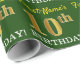 Este design de papel de embrulho apresenta uma mensagem como "First-Name's 10th BIRTHDAY!", com o "10th" a ter uma aparência de cor falsa/imitada em ouro. O nome pode ser personalizado, e o fundo é verde colorido. Talvez possa ser utilizada quando se dá presentes para o décimo aniversário de alguém. [~Z0000179]