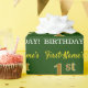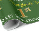 Este design de papel de embrulho apresenta uma mensagem como "primeiro aniversario do Primeiro Nome!", com as "1ruas" com aparência de cor falsa/imitada em ouro. O nome pode ser personalizado e o fundo tem cor verde. Talvez possa ser utilizado quando se trata de embrulhar presentes para o primeiro aniversário de alguém. [~Z0000179]