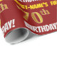 Este design de papel de embrulho apresenta uma mensagem como "PRIMEIRO NOME DO 70 DE ANIVERSÁRIO!", com o "70" a ter uma aparência falsa/imitada de cor dourada, e com o nome e "ANIVERSÁRIO" numa letra divertida e ousada. O nome é personalizável e o fundo é vermelho colorido. Um papel de embrulho como este poderia talvez ser usado no embrulho de presentes de aniversário que são dados a alguém em comemoração de seu setuagésimo aniversário. [~Z0000204]