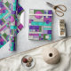 Este papel de embrulho de presente tem um padrão de deco de blocos quadrados em vidro digital manchado. Um design geométrico colorido de cor rosa, roxo, lacrimejo e verde. Um belo papel de embrulho para cobrir seus presentes. Você pode fazer o padrão neste papel de embalagem maior ou menor.