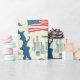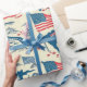 Um padrão maravilhosamente trabalhado, inspirado na vintage, com marcas e símbolos americanos icônicos. Com a Estátua da Liberdade, o mapa dos EUA, as cadeias montanhosas, e as bandeiras dos EUA todas colocadas sobre um fundo rústico, este papel de embrulho celebra o espírito dos Estados Unidos através de imagens eternos e reconhecíveis. Perfeito para acrescentar um talento nostálgico e patriótico durante os feriados nacionais ou durante todo o ano.