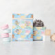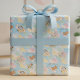 This wrapping paper is special for its charming, repetitive pattern of watercolor baby animals (elephant, bear, dog) flying different aircraft (biplane, paper plane, rocket). The light, pastel color palette on a cloudy blue background and the personalized text make it the perfect, whimsical wrapping for gifts for a baby shower or child's birthday with an "Up Up and Away" or travel theme.