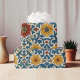 Papel de embrulho de Verão moderno inspirado na Costa Amalfi, Positano e Portugal. Apresenta uma cor aquosa clássica O padrão geométrico Azulejo português, com os florais azuis, amarelos e vermelhos botânicos para um toque de boho.