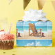 Numa praia arenosa sob um céu azul brilhante, uma cadeira de Adirondack de madeira segura uma guitarra acústica, enquanto um par de botas de cowboy repousa nas proximidades