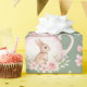 An adorable bunny nestled inside a delicate pink teapot, surrounded by watercolor flowers and lush green leaves. The soft sage green background enhances the gentle beauty of this pattern. Ideal for Easter or baby showers.