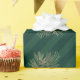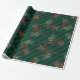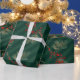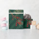 Um elegante e sofisticado papel de embalagem de férias, com galhos de pinheiro branco pintados a aquarelas, com mirtilos vermelhos, num rico fundo verde esmeraldo, com risca diagonal.