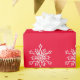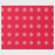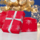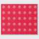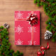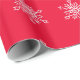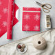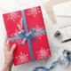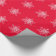 Enrole seus presentes com flocos brancos de neve em papel de embrulho vermelho de fundo.
