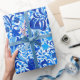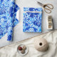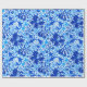 Papel embrulhado numa vintage, William Morris impressão floral de lírios estilizados e irlandeses, melhorado digitalmente e colorido, em tons de azul de cobalto profundo, azul-cerulano e azul-claro-claro-azul sobre um fundo branco