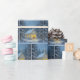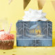 A white quaint church, with its illuminated windows, stands in stark contrast to the cool, snowy forest landscape surrounding it