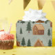 Soft illustrated wrapping paper featuring a cozy winter village with small houses and evergreen trees on a light, textured background. The pattern feels warm, calm, and timeless, with a gentle storybook mood.