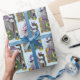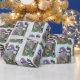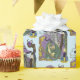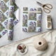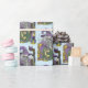 Um mago todo em roxo segurando um funcionarios que tem uma bola de cristal roxo. Um pequeno dragão verde, nó celta funciona, vela e uma borda de outono deixa tudo num pano de fundo azul claro
