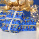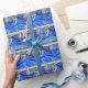 Cinza Irish Wolfhound sob um cobertor azul na cama