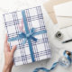 Um papel de embalagem projetado com um padrão de xadrez azul moderno de marinho em branco em tamanho grande. Personalize o fundo branco entre outras opções.