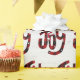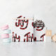 Chapéu de Papai Noel na xadrez de búfalo vermelha e preta JOY em estilo de fonte divertido em madeira branca com flocos de neve.