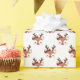 Papel de embrulho de Natal com um padrão de uma rena fofa com um nariz vermelho grande, chicoteadas, e um arco de xadrez em suas galhadas.