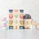 Uma variedade de xícaras de café e chá coloridas com diferentes padrões florais e de coração estão dispostas em um padrão repetitivo contra um fundo branco. Cada xícara mostra uma combinação única de cores e desenhos, criando uma exibição vibrante e simétrica.