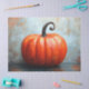 Uma pintura de safena rústica de uma abóbora laranja brilhante com um caule de curling contra um fundo texturizado.