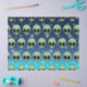 Um padrão de cabeça alienígena verde com olhos ovais grandes e pretos e um pequeno pedaço preto para a boca. O fundo é uma cor de gradiente azul-escuro a claro, pontilhado com estrelas brancas.
