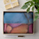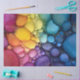 Um desenho abstrato vibrante com formas de bolhas translúcidas, arranjadas num gradiente arco-íris de vermelho a roxo, acentuado com speck de ouro a brilhar.