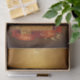 Árvore de Natal de ouro brilhante com lanternas, poeira de ouro e arcos. Modelo de papel tissue personalizável