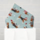 Gaivotas bonitas vestidas em roupas festivas de férias, chapéus de Santa e blusas de argila com Enfeites de natal dispersos em fundo azul.