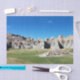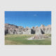 A fotografia mostra a beleza cênica do Parque Nacional das Badlands nesta fotografia. Está localizado nas Colinas Negras de Dakota do Sul. É uma maravilha geológica de erodir rabos, torres e pináculos. O sol lança sombras profundas que enchem fendas, fissuras e fendas como estrias paralelas e cristas em camadas de vermelhos, castanhos, latas e cinzentos. O verde da pradaria mista da National Grasslands e um céu azul claro adicionam cor a esta robusta paisagem de recortes rochosos.
