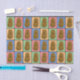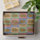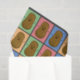 Papel tissue colorido e divertido em estilo pop art com um padrão de retângulos de diferentes cores, cada um com uma batata marrom feliz no meio.