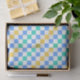 A colorful checkered pattern with alternating blue, green, and yellow squares on a white background. The design is vibrant and geometric, creating a playful tone.