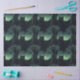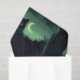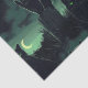 Um gato preto elegante com olhos verdes brilhantes sentados sobre um posto de cerca, com uma lua crescente ao fundo