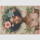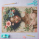 The artwork includes warm skin tones, soft blush makeup, and muted pastel florals in pink, green, and cream tones. The vintage paper backdrop adds an aged, antique feel while keeping the overall design feminine and elegant.