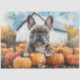 Uma pintura ao estilo aquarela de um Bulldog Francês sentado entre abóboras em frente a um celeiro branco rústico. As árvores de outono enquadram a cena com tons quentes de ouro, criando uma atmosfera sazonal aconchegante.