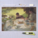 Este design apresenta uma pintura do artista italiano Giuseppe de Nittis (1846-1884). Mostra uma família tomando café da manhã em uma mesa formal no jardim. Uma mulher e um menino estão sentados na mesa, e há um assento vazio, talvez onde o marido da senhora estivesse sentado. Há patos e cisnes caminhando sobre a grama no jardim, e o menino está tentando alimentar um dos pássaros com sua comida. A família está comendo de pratos finos de porcelana e há linho branco na mesa. Há também um buquê de flores em um vaso na mesa. A arte original foi pintada por Giuseppe de Nittis em 1883.