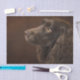 Design apresenta um retrato fotográfico de um cão com cabelo castanho sobre fundo castanho escuro.