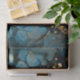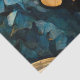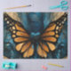 Borboleta monarca com um pouco de estilo steampunk adicionado em papel de tecido. Asas borboletas laranja e amarelas esticadas e esticadas contra fundo azul e ouro tornam este papel de tecido bastante dramático.