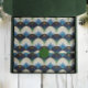An abstract blue and gold pattern depicting the forest and the night sky in a pattern of Art Deco arches