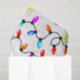 Colorful Christmas string lights with red, orange, yellow, light blue, pink, aqua, and green colors on a black cord in the snow. The retro lights my family used when I was a child inspired me to design this pattern. The snowy background is from an actual photograph. It's shown here on festive gift wrapping tissue paper. Wrap your Christmas gifts or decorate with this unique string lights in the snow design!