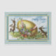 Coelhos de vintage arrastando um ovo grande ouro com flores coloridas envoltas com um papel de tecido de fita